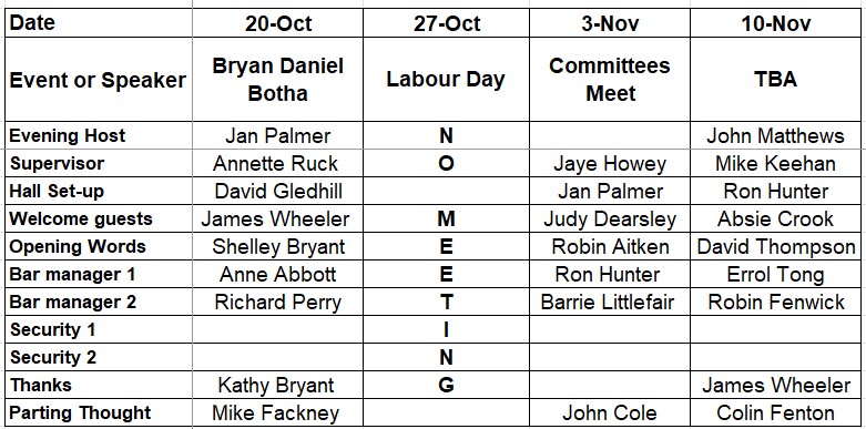 A reminder that it's your responsibility to find a replacement if you are unable to fulfil your duty. Please let Jan Palmer know of any changes to the roster.