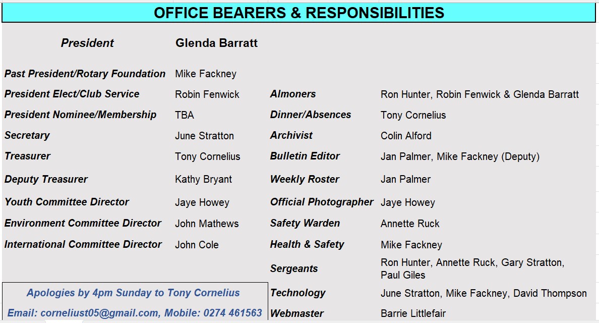 Thank you to all who attended the meeting on Monday where we held the AGM/Club Assembly for Eastern Hutt Rotary. I personally felt it was a very productive meeting given the amount of information we needed to attend to. Thank you to all officers who presented their reports showing the extent of mahi (work) you have all managed to discuss and plan for the remaining six months of this rotary year.
