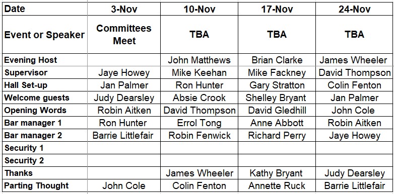 A reminder that it's your responsibility to find a replacement if you are unable to fulfil your duty. Please let Jan Palmer know of any changes to the roster.
